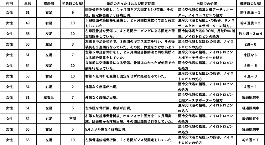 50歳の女性です。左足の痛みを訴えて来院されました。2ヶ月前に左第5中足骨骨折をされ他院にて3週間のギプス固定のち、装具を2週間装着されていました。その間、体重をかけないようにして過ごしておられました。初診時の疼痛スコア(NRS)3程度でした。そこで、当院ではノイロトロピンの処方と温冷交代浴の指導を行いました。