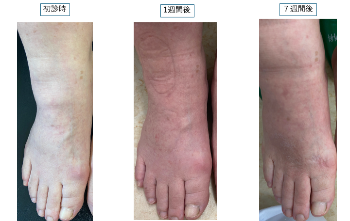 上の図は初診時(左図)と1週間後(中央図)と7週間後(右図)の写真です。初診時と比べると7週間後には、腫脹が軽減していました。日常生活上で歩行時痛がなく、疼痛スコア(NRS)は1に回復していました。