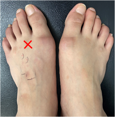 上の写真は初診時の外観写真です。左第2中足骨骨頭部背側(赤バツ印の部分)に圧痛が確認できました。