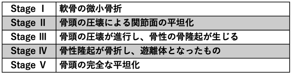 ステージが進行するにつれて、骨頭軟骨の損傷程度が拡大していきます。