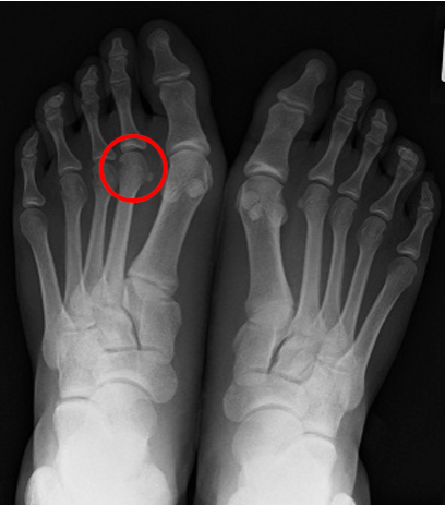 第2中足骨頭の変形の度合いは左右の足部を比較することでわかります。