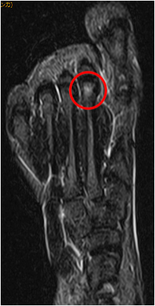 上の写真は左足のMRI画像です。レントゲン写真で確認した第2中足骨骨頭部にて輝度変化(赤丸で囲んだ部分)を確認できたので、早期のFreiberg病と診断しました。