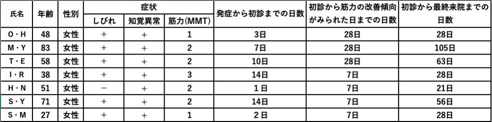上の表で示す通り、全例、初診時に知覚異常と筋力低下を認めています。特に筋力低下は手関節の背屈が完全にできない状態です。患者さんとしては急に手首を返すことができなくなったことに不安を覚えて来院されていることがわかります。